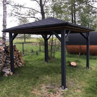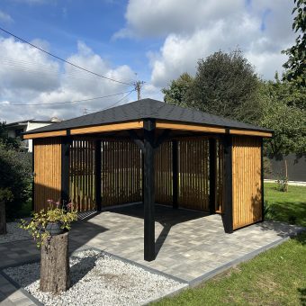 Drewno świerkowo-sosnowe – solidna, naturalna konstrukcja o pięknej strukturze Lamelowe ścianki boczne – zapewniają delikatne zasłonięcie, cyrkulację powietrza i kameralny klimat Zabudowana tylna ściana – dodatkowa prywatność i ochrona przed wiatrem Dach typu kantówka z pełną podbitką i orynnowaniem – elegancki wygląd i skuteczna odprowadzanie deszczu Pokrycie dachu gontem bitumicznym – trwałe, wodoodporne i estetyczne rozwiązanie Podwójna impregnacja preparatem Drewnochron – skuteczna ochrona drewna na lata Dwa wejścia – przestrzeń otwarta i przewiewna, idealna na ciepłe wieczory Opcja montażu z wbudowanym grillem – gotowe miejsce na przygotowanie posiłków na świeżym powietrzu!
